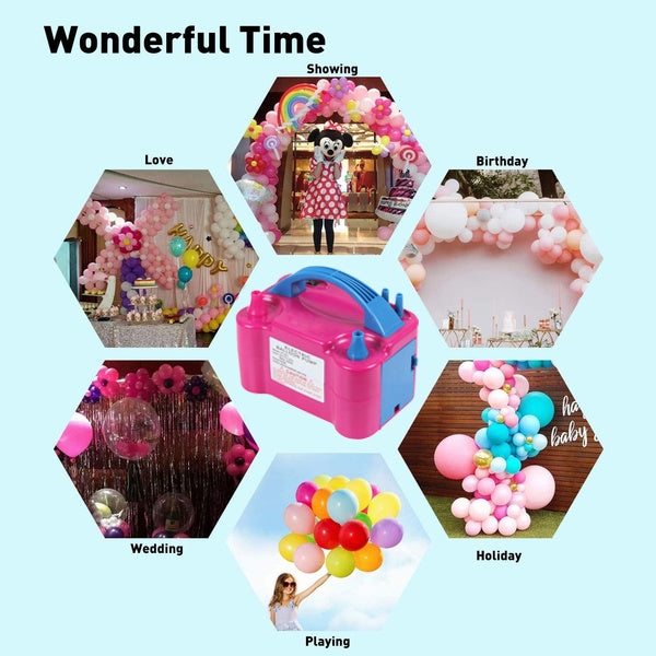 \r\nPortable Dual Nozzle Electric Balloon Blower Pump Inflator ? Portable Dual Nozzle Rose Red Electric Balloon Blower Pump Inflator For Decoration. This electric balloon pump is commonly used in some activities/festive/party/celebration How to Use - The Most Effective Way First - Plug the US port into an outlet Second - Pick up a balloon with any sizes Third - Insert the balloon neck or opened tail into a BLUE nozzle. Forth - Press the nozzle and let go to release air into the balloon Fifth - Practice, Practice, and Practice! INFLATE BALLOONS WITHOUT ANY HASSLE This quality electric balloon pump will inflate hundreds of decorative latex balloons in super-fast time, and commonly used in some activities/ festival/ party/celebration/ decoration. Inflate different sized balloons thanks to the practical dual-nozzle design. Simply attach your balloon and choose your inflation mode. This electric balloon pump fit to latex balloon and decorative balloon. Double pump, balloon air pump. Save yourself time, hassle, and precious oxygen with this powerful electric balloon pump. Portable Dual Nozzle Rose Red Electric Balloon Blower Pump Inflator for Decoration DURABLE AND EASY TO CARRY Compact at just 8.3 x 6.6 x 5.5 inches and made of durable aluminum, Light Weight and Portable design. Easily create a warm atmosphere. Totally safe to use, it fills balloons with AIR The balloon pump will auto-disconnect for safety when left unattended for a period of time. The air inflator features suction cups on the bottom to keep it steady, a cord to plug into a wall socket, and tips to attach balloons to. Simply hold any latex balloon over the tip, push, and inflate within seconds.