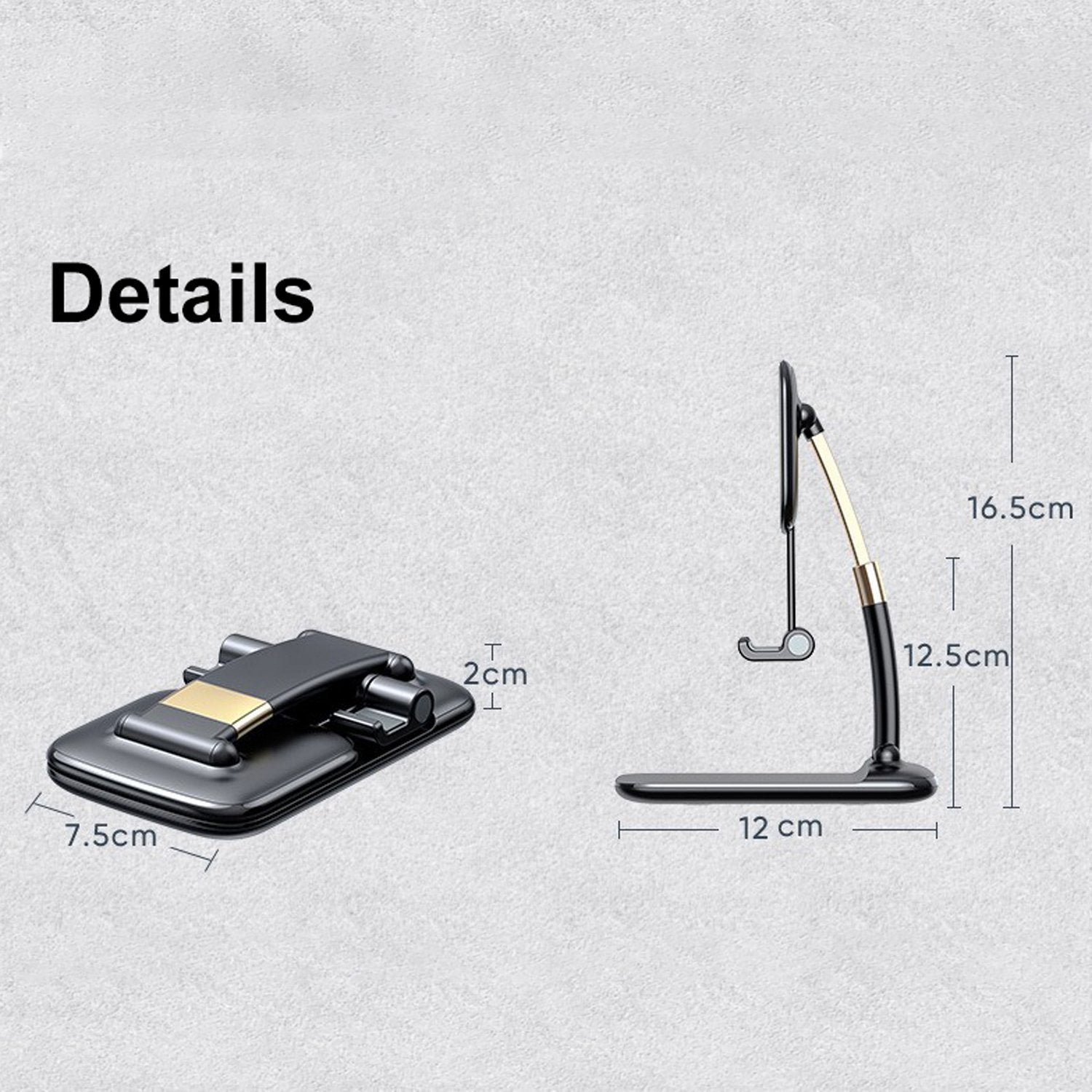 \r\nFoldable Portable Desktop Adjustable Cell Phone/Mobile Stand/Holder/Mounts for Desk, Desktop Tablet Stand Durable and universal tablet stand with rubber grips on the holding portion ensure that the tablet does not easily slip or fall. In terms of convenience, this stand can be used for multiple situations: Video-calling hands free Viewing a recipe while cooking Watching videos while multitasking or relaxing Perfect Companion in FaceTime/ Watching Video The hooks over the tablet holder will never block your screen, which is quite user-friendly for you to see the subtitle clearly. And it will not block the camera or cover the mouthpiece. Angle Adjustable Extremely well-built. Machined aluminum with black powder coating. Just fold it up and just toss it in the backpack. It\'s very slim when it\'s folded and very light. Fully Foldable The adjustable plate has very strong hinges that allow it to be adjusted in many ways. It supports plenty of devices, from phones up to larger tablets and even portable game consoles like the switch. Features: Angle and height are adjustable according to your needs Non-slip silicone pad, won\'t scratch the Device Foldable design, compact and portable Wide application: study online, live broadcast, video conference, watching movies, etc. Specification: ? Material: ABS + aviation aluminum alloy tube ? Size: 9×12.5×25.2 cm ? Weight: 258g ? Compatible with: All Android & Smartphone for tablet under 7.9 inches. Dimension:- Volu. Weight (Gm) :- 130 Product Weight (Gm) :- 150 Ship Weight (Gm) :- 150 Length (Cm) :- 15 Breadth (Cm) :- 10 Height (Cm) :- 4